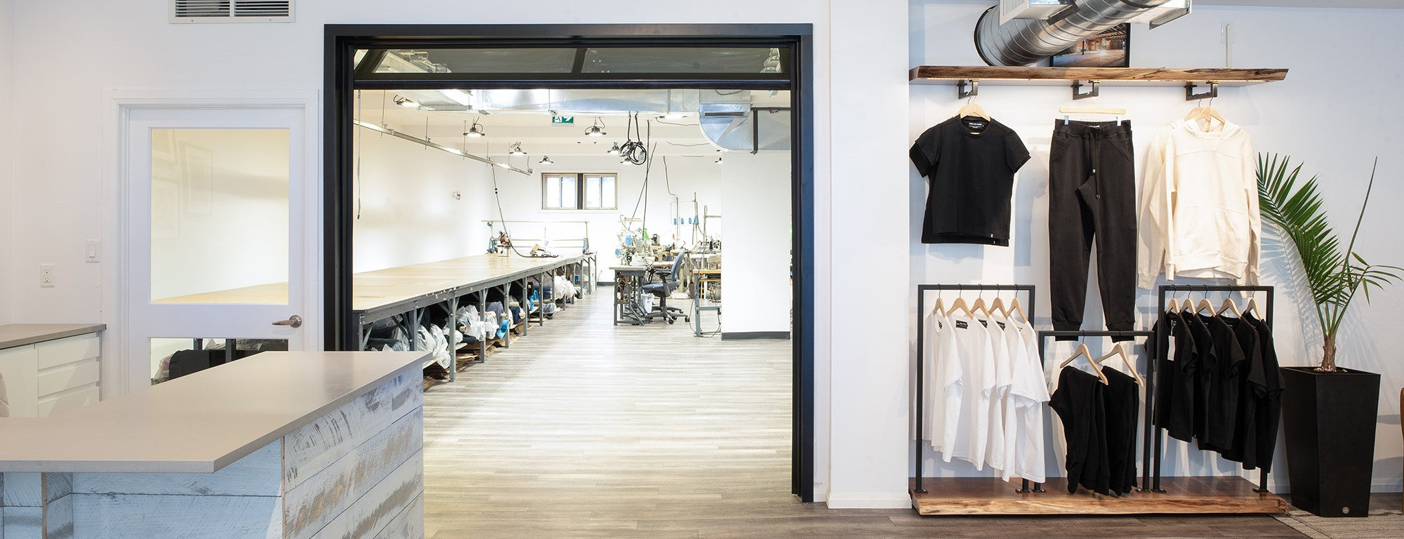 Everything is made right here in our Oshawa factory, by a single person from start to finish. You can see it all happen because our factory is integrated into our retail store. Complete transparency about how your clothes are made.