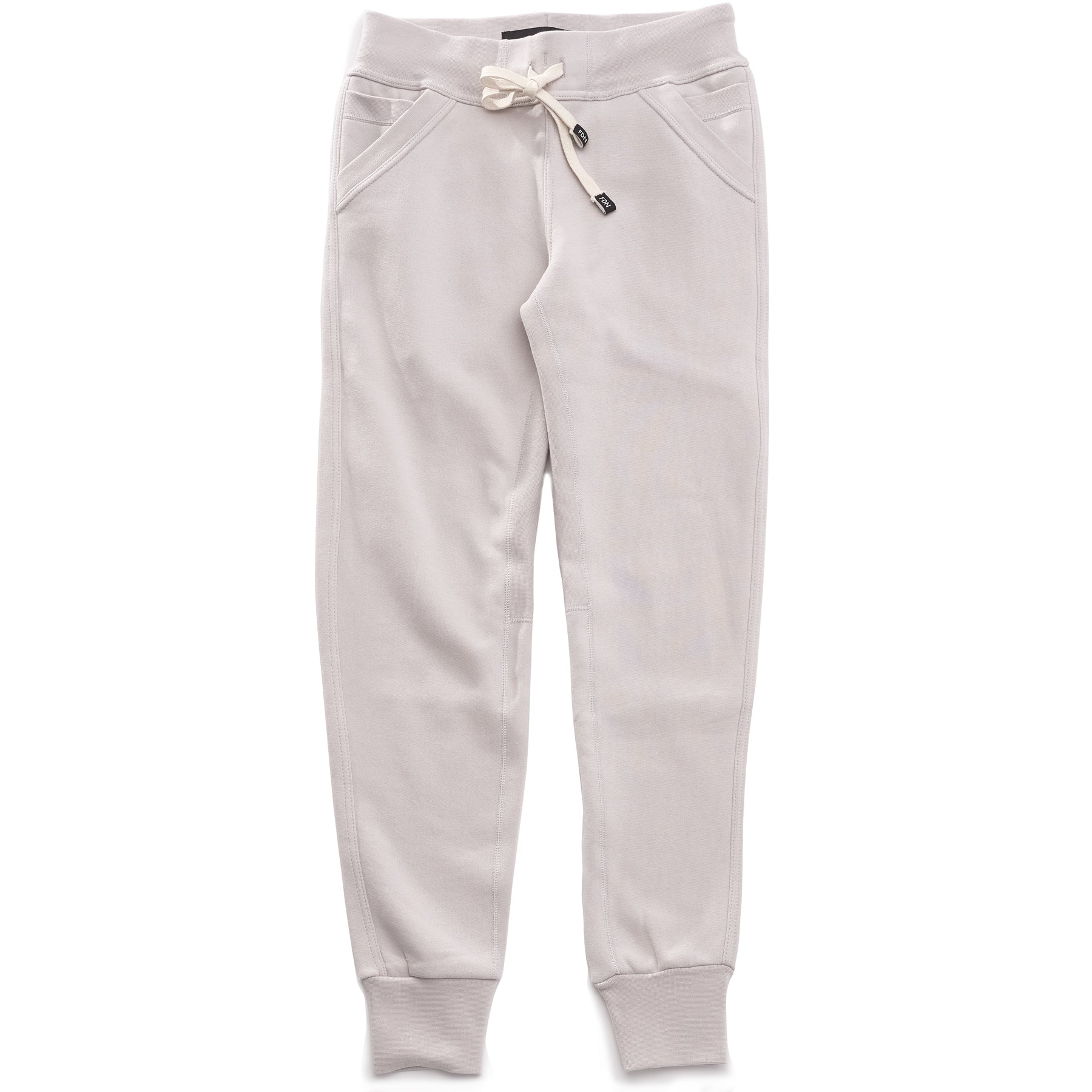 Sustainable Mens Womens Warm loungewear Sweat Pants Comfortable Luxury Light Grey Sueded Napped Soft French Felted Cotton Terry Fabriqué au Canada. High Waisted with slim tailoring in the leg. Angled front pockets with interior cellphone pockets and inner leg rib gusset. Cotton Drawcord clothing FDN made in canada