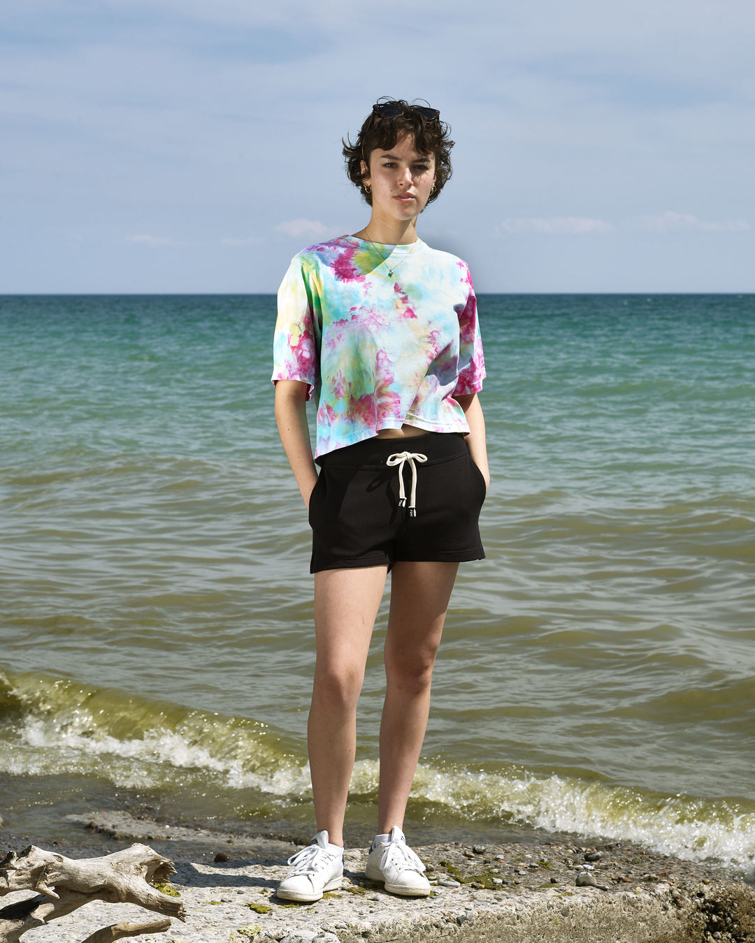 These were designed to maximize leg exposure, but to still stay super comfortable for the wearer. Like all of our shorts styles, they have a high rise so they can be worn high waisted and look great with our relaxed fitting Cropped Tees or Classic T-Shirts tucked in.